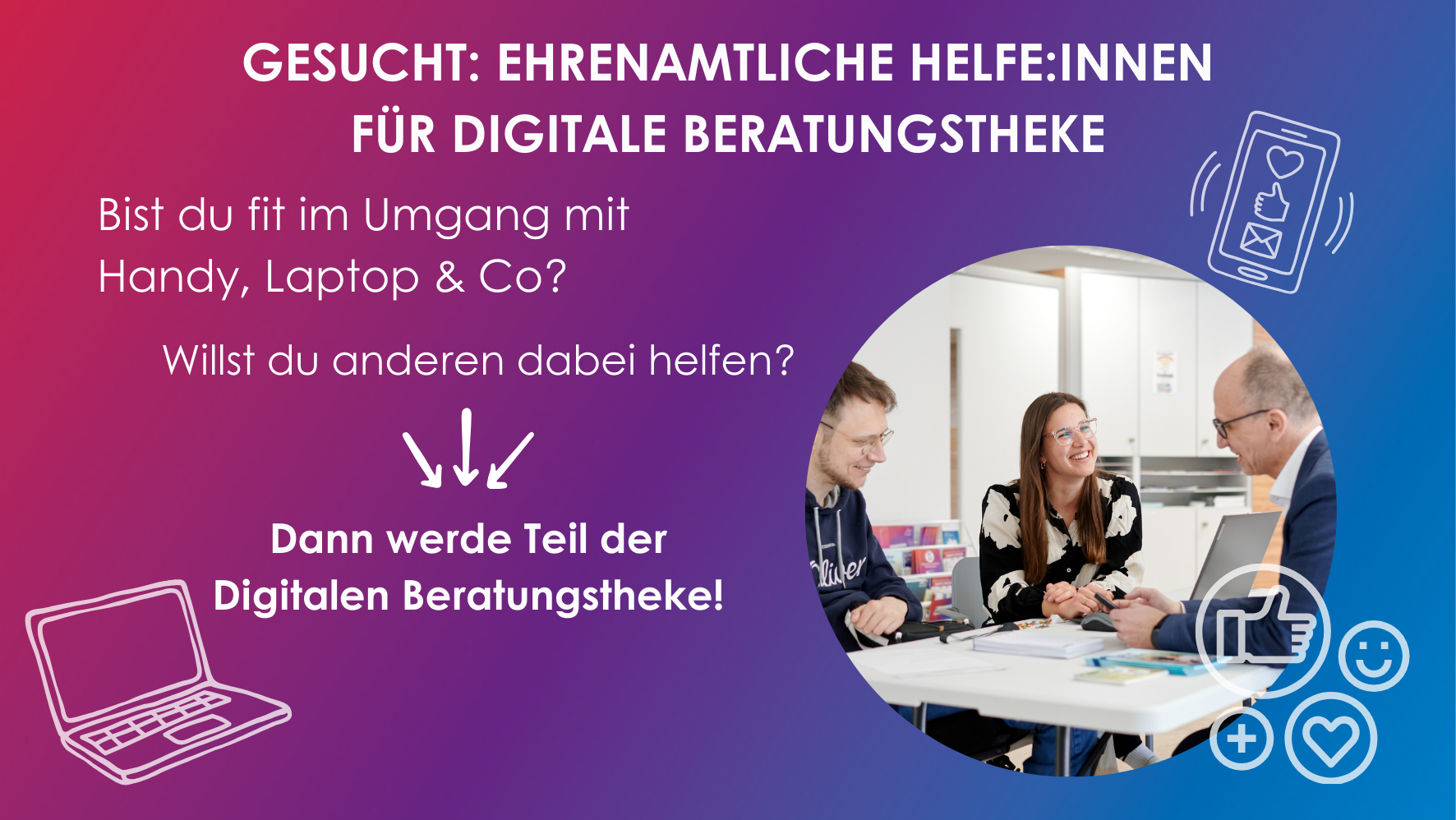 Um anderen bei ihren Fragen zum Umgang mit digitalen Geräten helfen zu müssen, muss man kein Experte sein. Ein solides Wissen zu gängigen Anwendungen und Funktionen genügt. Auch muss niemand eine komplette Beratungstheke alleine stemmen. Bereits zwei bis drei Stunden pro Woche reichen aus, um beispielsweise eine halbe Beratungsschicht zu übernehmen. Neben der Möglichkeit, anderen ganz konkret im Alltag zu helfen, haben Ehrenamtliche die Chance, die Weiterentwicklung des Projekts selbst mitzugestalten.