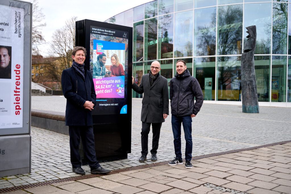 Gestern zeigte unser Projektmanager Jonas Behr dem Programmleiter von Smart City, Sascha Götz, und dem Wirtschafts- und Digitalisierungsreferenten der Stadt Bamberg, Dr. Stefan Goller, die neue Oberfläche des BamBoards vor der Konzert- und Kongresshalle.