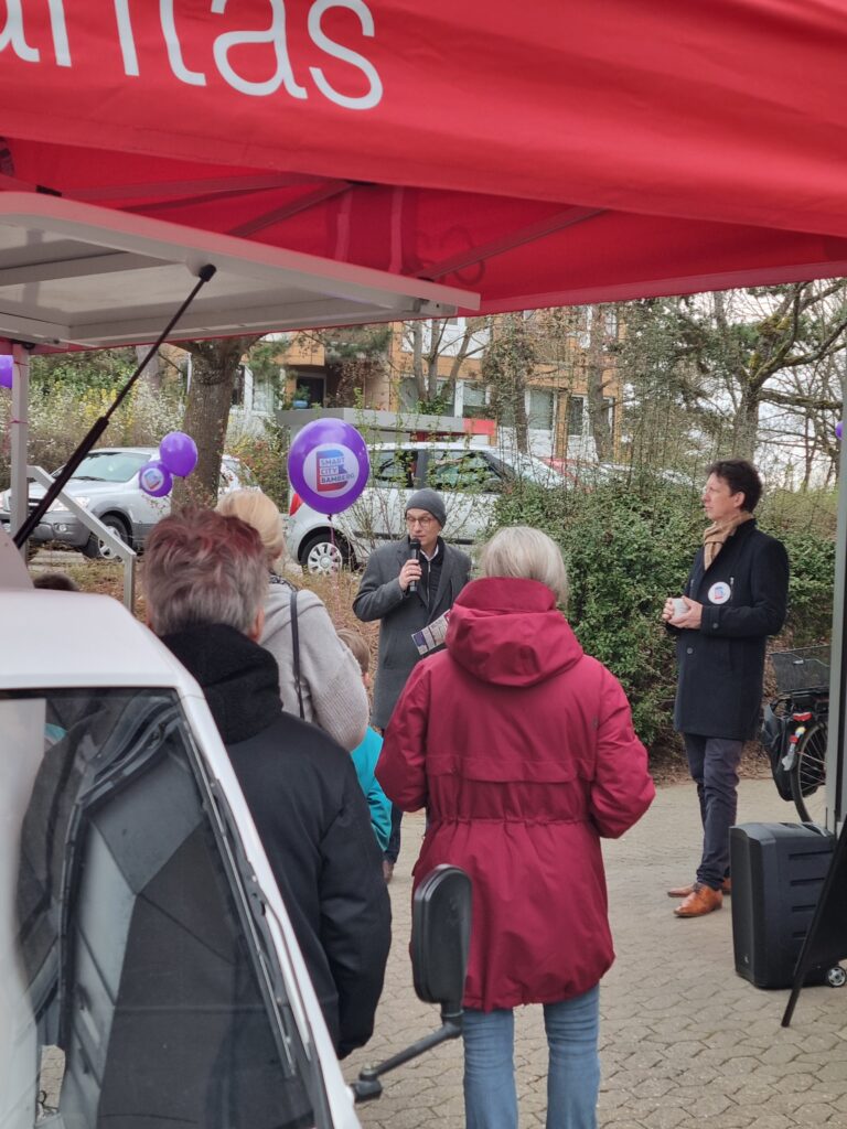 Obwohl das Wetter am Montag noch kalt und trüb war, kamen Interessierte zur Eröffnungsveranstaltung, um sich über die Projekte von Smart City Bamberg zu informieren und Feedback dazu zu geben. Mit einem Kaffee vom Cafémobil Paul der evangelischen Kirchgemeinden Bambergs wurde es auch schnell wieder warm und der Austausch konnte weitergehen.