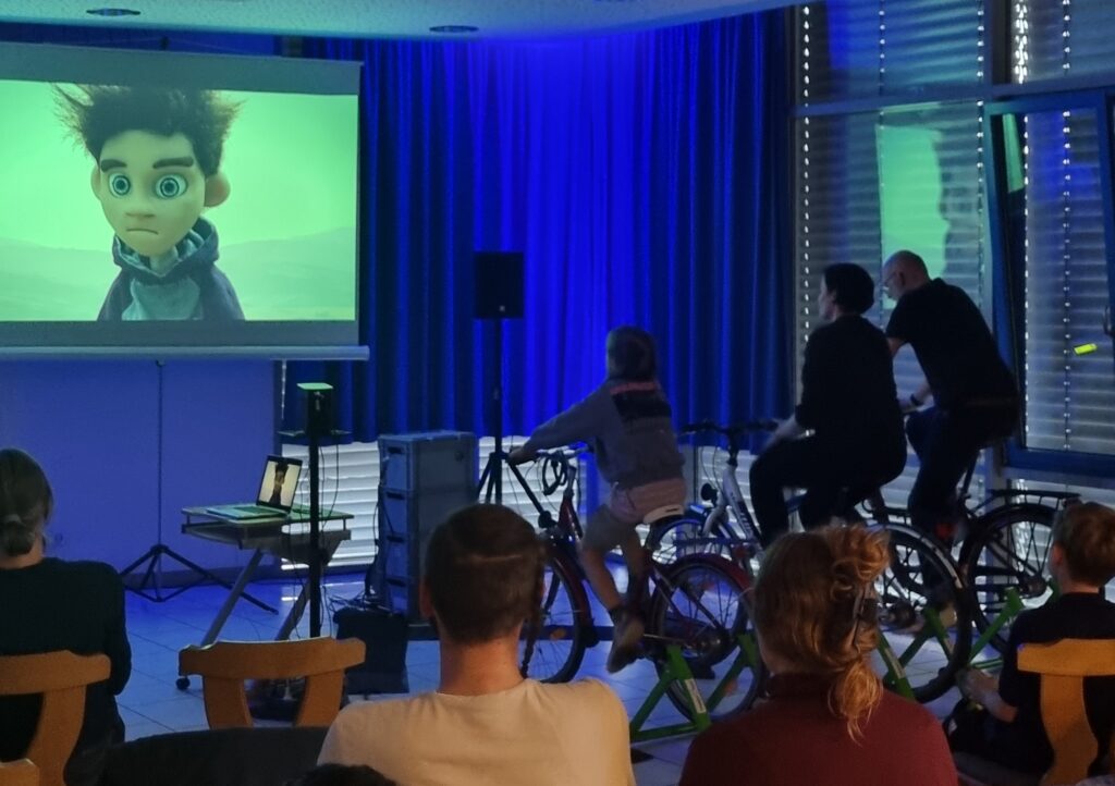 Den Abschluss der Smarten Woche Südwest bildete ein Kinoerlebnis der besonderen Art: Film-Highlights der Bamberg Kurzfilmtage wurden gezeigt. Doch damit nicht genug: Die benötigte Kinotechnik wurde von den Zuschauenden selbst angetrieben, indem immer drei Teilnehmende im Wechsel den dafür nötigen Strom auf Fahrrädern erzeugten. Eine ganz neue Erfahrung für alle Anwesenden!