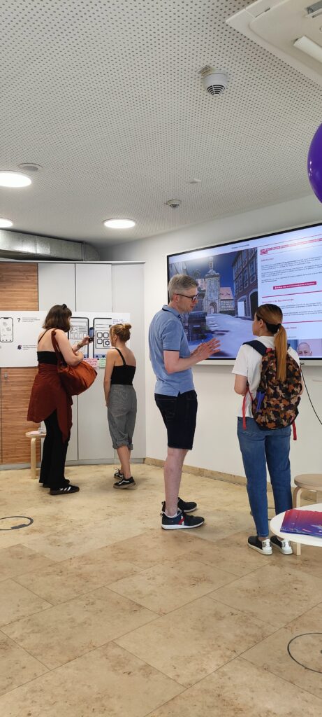 Smart City Bamberg stellte direkt drei Projekte vor: den digitalen Zwilling, das BamBoard und die Smart City App. Neben Entdecken und Ausprobieren stand hier vor allem auch Wünsche äußern und Feedback geben auf dem Programm. Das Smart City Research Lab war auch mit dabei. Prof. Dr. Patrick Tobias Fischer ist Professor für User Experience and Design und hat gezeigt, wie man sich auch ohne Maus und Tastatur, sondern mit einem Rad durch ein Stadtmodell bewegen kann.