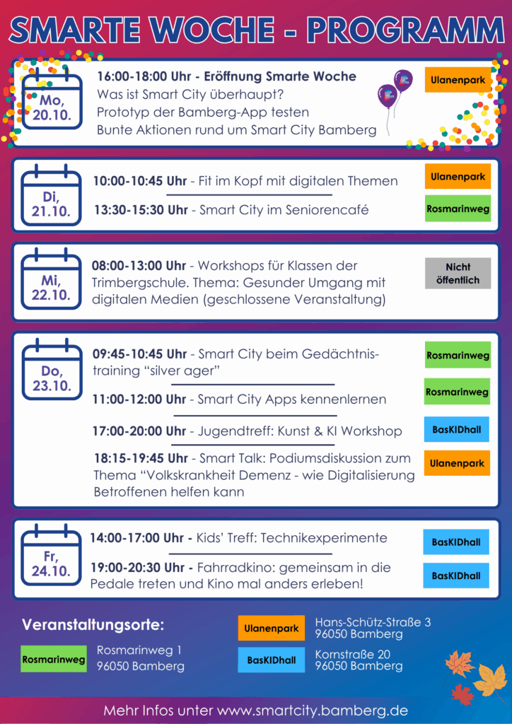 Nach den Smarten Wochen Südwest-Babenberger Viertel (März) und Bamberg-Ost (Juni) sind nun vom 20. bis 24. Oktober die Stadtteile Gereuth und Wunderburg an der Reihe. Wieder einmal lockt ein buntes Programm, das dazu einlädt, Digitalisierung zu entdecken und zu erleben, und auch mehr über die Projekte von Smart City Bamberg zu erfahren. Bei den verschiedenen Veranstaltungen im Quartiersbüro am Ulanenpark, dem Bürgerhaus Rosmarinweg und der BasKIDhall ist für jeden etwas dabei!