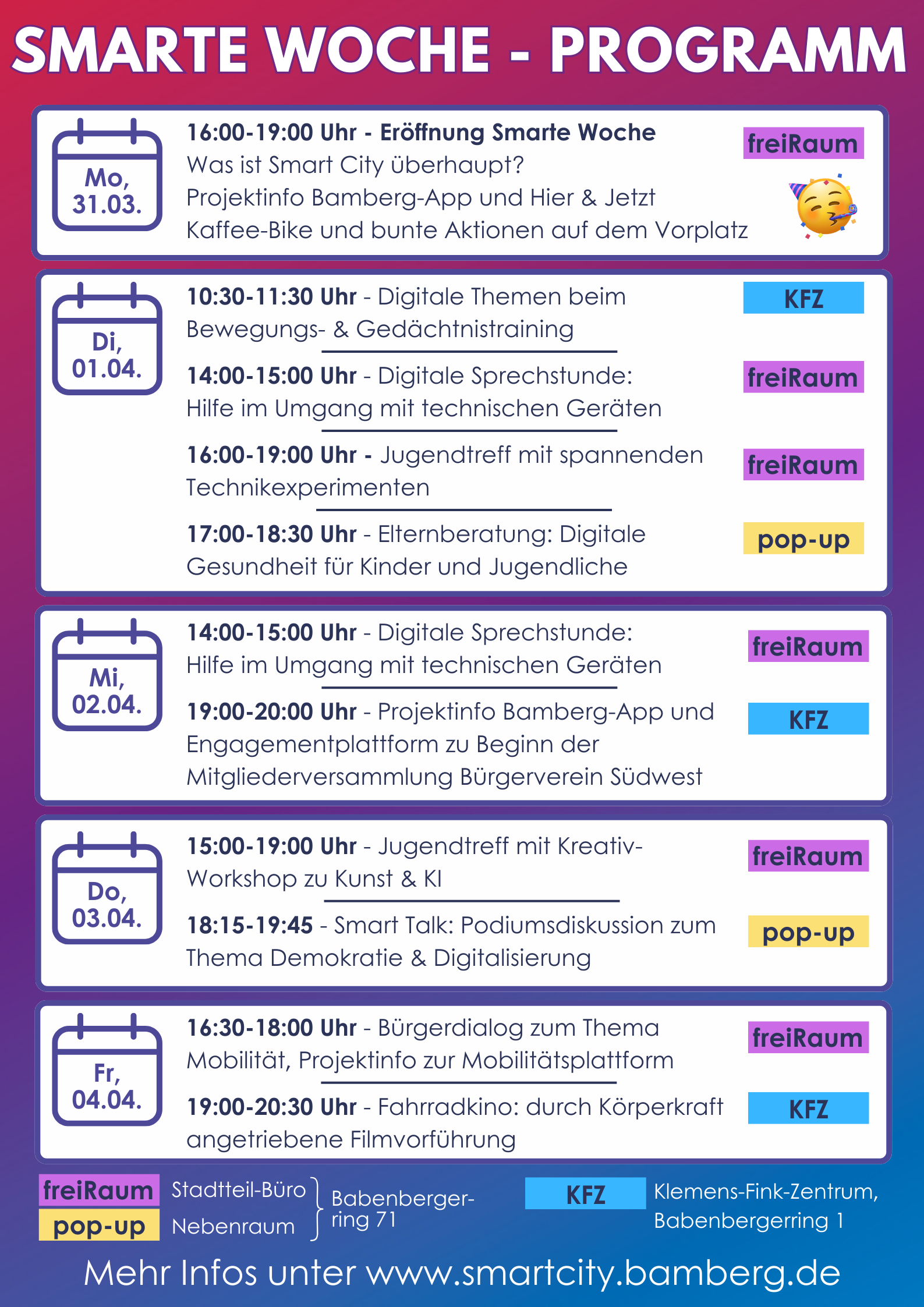 Hier findet ihr weitere Infos zu den einzelnen Programmpunkten den Smarten Woche in Bambergs Südwesten!
