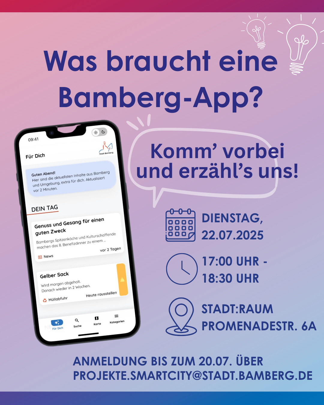 Digitale Services und Neuigkeiten aus der Verwaltung, Erinnerungen an die Müllabfuhrtermine oder ein personalisierter Veranstaltungskalender – eine städtische App bietet viele Möglichkeiten für die Menschen in Bamberg. Am 22. Juli 2025 können Sie mitreden, was die Bamberg-App alles leisten soll!